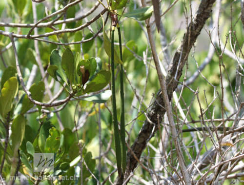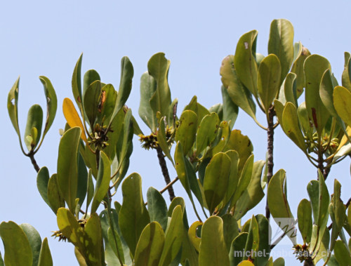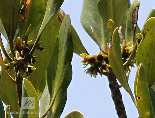 Description : C'est un arbre de la famille des Rhizophoracées mesurant 5 à 25 m. de hauteur et 20 à 40 cm de diamètre. L'écorce est grise claire ou rougeâtre à brune comportant des fissures irrégulières.