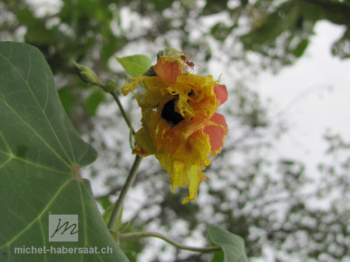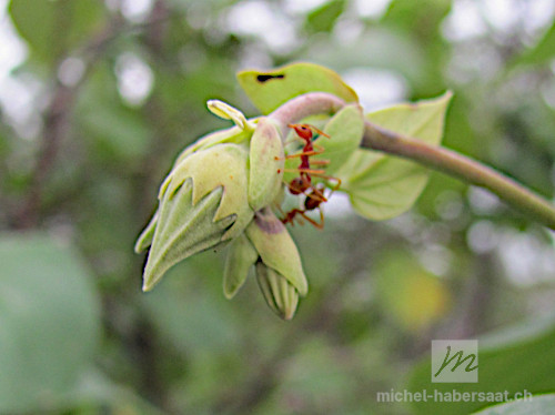 Les fruits sont des capsules sèches, brunes claires et ovoïdes. Elles se fendent en cinq segments subdivisés en deux compartiments qui s'ouvrent sur de petites graines noires en forme de reins.