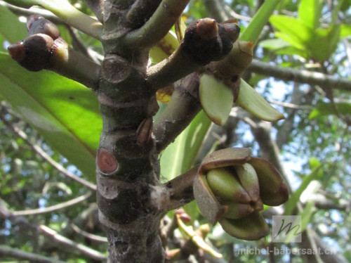 La couleur de l'écorce varie d'une espèce à l'autre. Elle est brune claire voire grise foncée chez R. x lamarckii, grise foncée chez R. apiculata, rougeâtre voire grise claire chez R. stylosa et foncée à noire chez R. mucronata.
