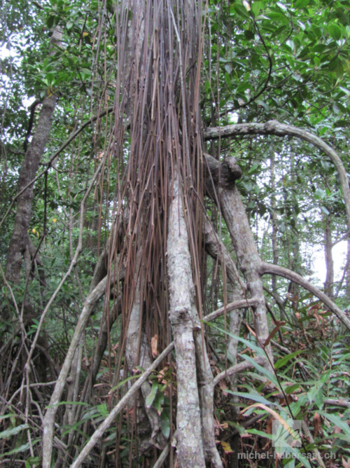 L'oxygène : Les racines de Rhizophora ne lui permettent pas seulement de s'ancrer dans la vase, mais elles ont aussi l'avantage d'être perméables à l'air. Toute la partie supérieure des racines ainsi que le tronc et les racines aériennes qui descendent en rubans des branches possèdent cette caractéristique. Ce système permet à l'arbre de « respirer » dans ce milieu anoxique. Les racines possèdent encore un système d'ultrafiltration qui lui permet d'expulser le sel. Et, si toutefois du sel parvenait à s'infiltrer, il est alors stocké dans les vieilles feuilles avant qu'elles ne tombent.