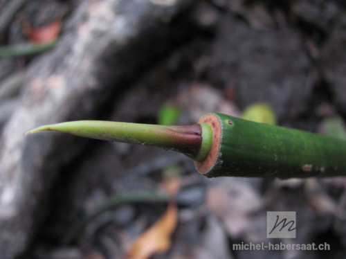 La viviparité : Les fruits de Rhizophora sp. ne contiennent qu'une seule capsule. Les plantules de ces espèces germent lorsque le fruit se trouve toujours attachés aux arbres et prennent( ?) la forme d'une propagule. Ainsi la nouvelle plantule continue d'être alimentée par la plante mère et de bénéficier directement des apports nutritifs en sucre et sels minéraux dans un milieu protégé. Cette méthode appelée viviparité est responsable des longues et fines propagules vertes qui poussent hors des capsules brunes-foncées des fruits. Il s'agit en fait des hypocotyles qui poussent tout en longueur et se présentent sous forme épaisse, charnues et solide.