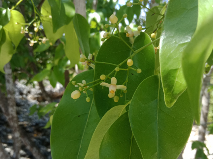 Les fleurs mesurent environ un demi-centimètre. Ce sont de petites fleurs blanches à 4 pétales séparés jusqu'à la base, maintenus à l'horizontale, et, 8 étamines soudées en tube. Elles sont réunies en inflorescences, mais, généralement, un seul fruit par inflorescence fini par pousser. Elles dégagent un puissant parfum pour attirer les abeilles qui semble être leur principal pollinisateur.