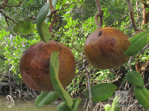 Les fruits sont globulaires avec un diamètre de 10-25 cm de diamètre de couleur brun-jaune légèrement orangé. Le fruit grossi rapidement. Il peut peser jusqu'à 3 kg. A maturité il se fend ou tombe de l'arbre libérant 8 à 10 graines qui sont emportées au loin par les courants. Ces graines, qui ont l'aspect de quartiers triangulaires au tégument épais, flottent très bien. Un seul fruit peut contenir environ 8-10 graines.