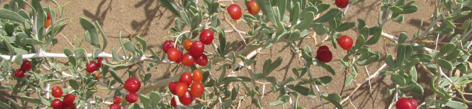 Description: Perennial plant of the Nitrariaceae family. It is a woody shrub that can grow up to 1.5 m high. Rigid, ligneous, stems often with sharp spines. Leaves simple, alternate, obovate to elliptic. They measure 1-3 cm long with a fleshy appearance. Flowers are small, white to pinkish, with 5 petals. The fruits are edible red drupes.