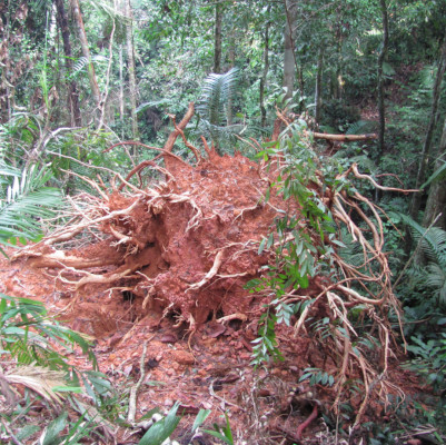 Le sol des forêts tropicales, relativement pauvre, empêche les racines de s’enfoncer profondément, ce qui fragilise l’ancrage des arbres. Ceux-ci ne sont donc pas aussi bien maintenus que les conditions le demandent. Ainsi, un arbre dépassant la canopée peut être renversé par les vents violents qui soufflent en certaines périodes de l’année. Lorsqu’il chute, que ce soit par le vent, un parasite ou l’âge, il entraîne souvent dans sa destruction plusieurs voisins, créant une clairière baignée de soleil. Cet espace devient une opportunité à saisir pour les jeunes plantes, qui doivent croître rapidement : seules celles qui atteignent la canopée en premier peuvent s’y maintenir.